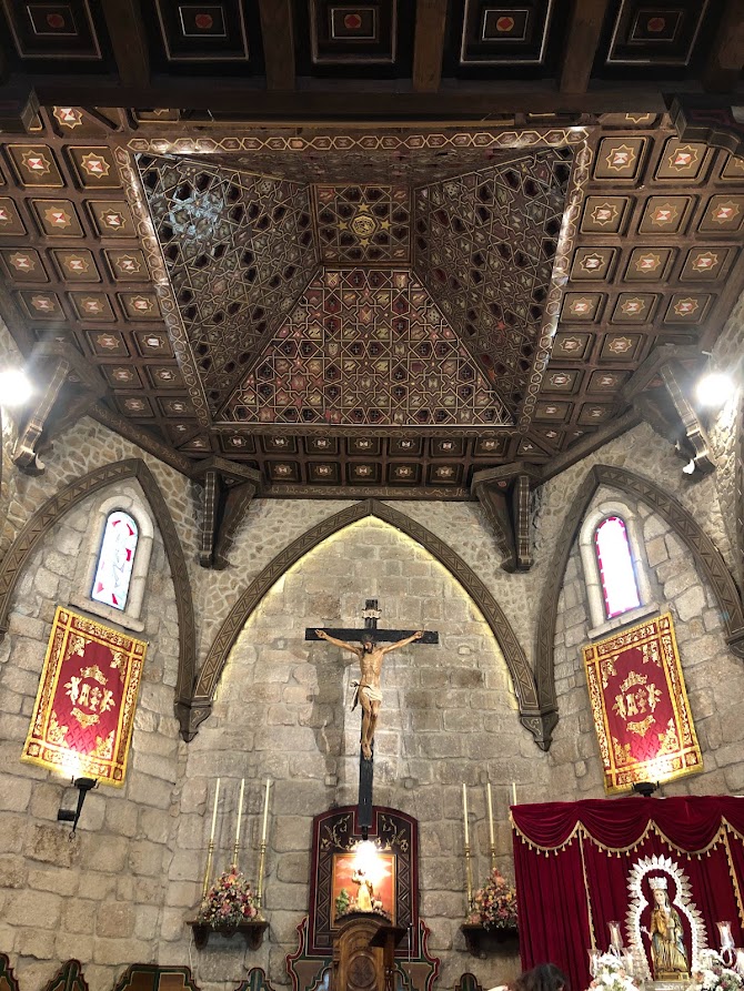 Visitas imprescindibles son también : el Castillo de los Mendoza (s. XIV-XV), de arquitectura mudéjar; la Torre del Reloj (del s. XIV), el punto más alto de toda la muralla, con 16 metros de altura; o el Palacio del Bosque , un palacio en ruinas del s. XVI que sirvió como pabellón de caza. Conoce la Iglesia de Santa María del Castillo (s. XIV), de estilo gótico, que se construyó posiblemente sobre una mezquita y fue restaurada en los años 80 con elementos mudéjares, tras un incendio poco antes del comienzo de la Guerra Civil. Aquí queremos hacer una especial mención a Ángel López que hizo la decoración y Francisco Sanz Martín, mi padre, que, junto con los alumnos de la escuela San Francisco de Asís, fueron los encargados de realizar el artesonado. Acércate hasta el Puente del Arrabal o Puente Viejo , cuya construcción se estima entre el s. XIV y el s. XV, que comunica el recinto amurallado de Buitrago del Lozoya con el antiguo arrabal del Andarrío; aún conserva en perfecto estado su vano central de medio punto y algunos arcos de lo que fue un acueducto que conducía el agua hasta los arrabales.